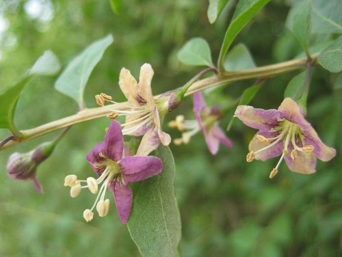 Pode atingir entre 1 a 3 metros de altura. As flores são de cor rosada e lilás. Esta espécie destaca-se das outras pelo grande comprimento da folha que pode atingir até 7 cms. É normal o aparecimento de alguns espinhos ao longo dos ramos. O fruto, as conhecidas bagas de goji, são de cor laranja e vermelhas quando maduras. Têm formato ovolóide e tamanho de 1-2 cms e cada baga possui no seu interior entre 10 a 60 minúsculas sementes.